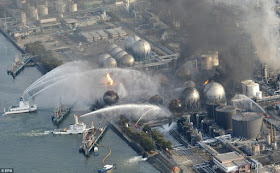 Ships try to extinguish a blaze at oil refinery tanks in Ichihara, Chiba Prefecture, after the tsunami that struck in March, 2011. Credit: EPA